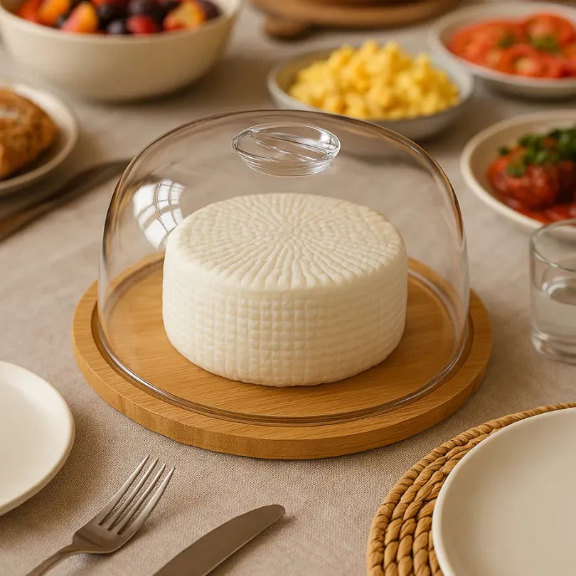 O Porta Queijo Bambu com Tampa Acrílico é multiuso e perfeito para armazenar, proteger e servir queijos, frios, frutas, bolos, manteiga e muito mais com elegância e funcionalidade.